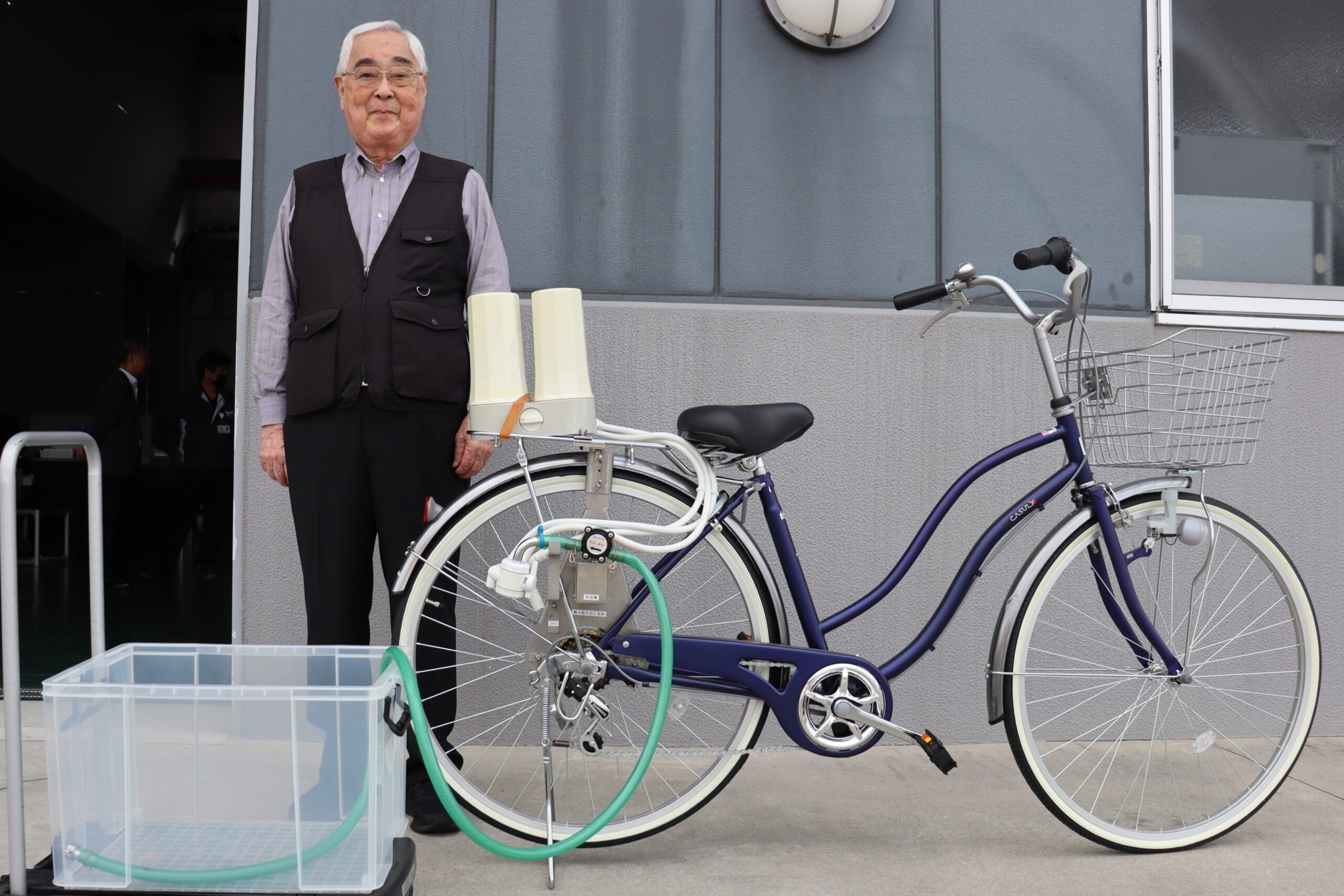 日常使用している多段式自転車に設置し、家庭用の浄水器をつなぐとお風呂やプールの水を生活水に変え、同時にUSB端子からスマホ2台の充電もできる、まさに緊急・災害時に役立つ新製品です。最外周のギアにチェーンを噛み込ませ、荷台に蝶ねじで固定するだけで工具も技能も不要、わずか5分で完成します。浄水器は、据置型もアンダーシンク型も対応可能。弾み車となる後輪をペダルで駆動し、ポンプと発電機を稼働させるしくみです。