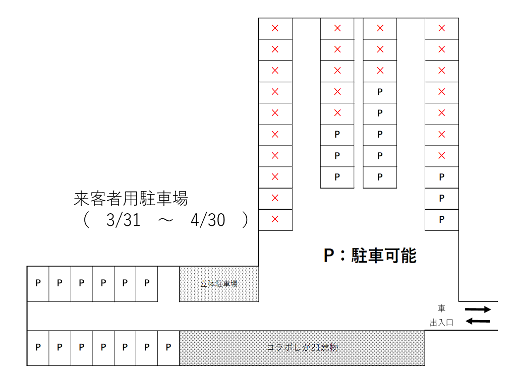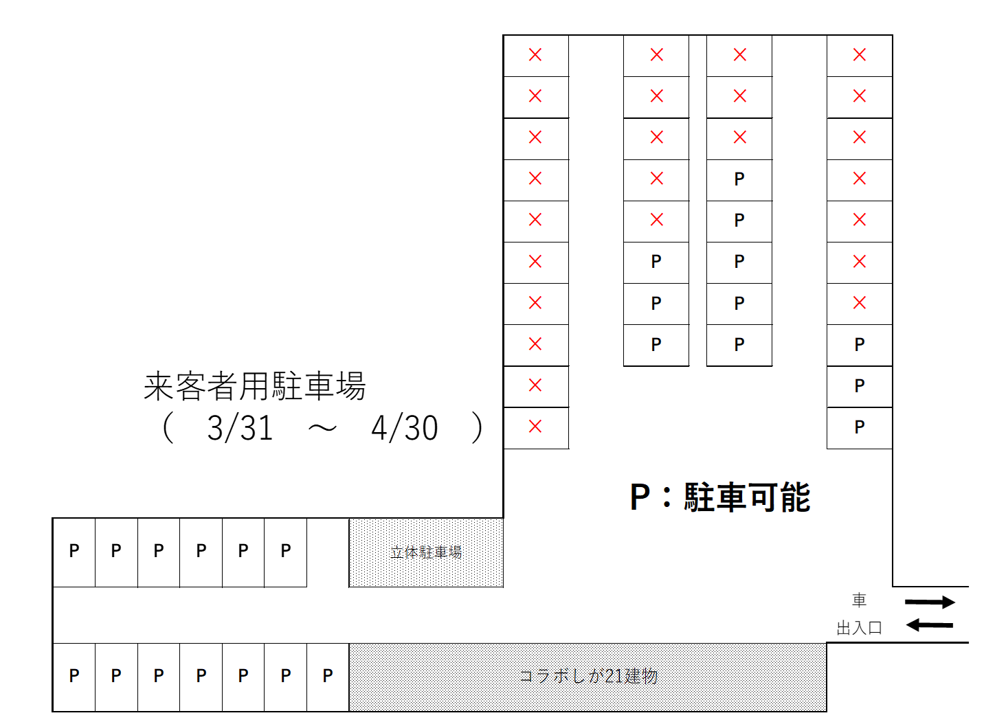 3月31日(火)~4月30日(木)の間、敷地内工事に伴い、コラボしが21来客者用駐車場の一部がご利用いただけません。そのため、駐車可能台数が通常より少なくなります。